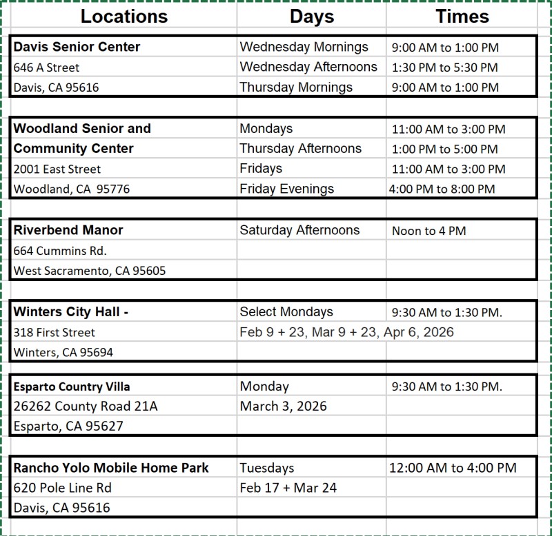 Yolo County has several sites and sessions: (the days and times are tentative at this point and subject to change by us or our host sites) We start Tax Preparation the first week of February.