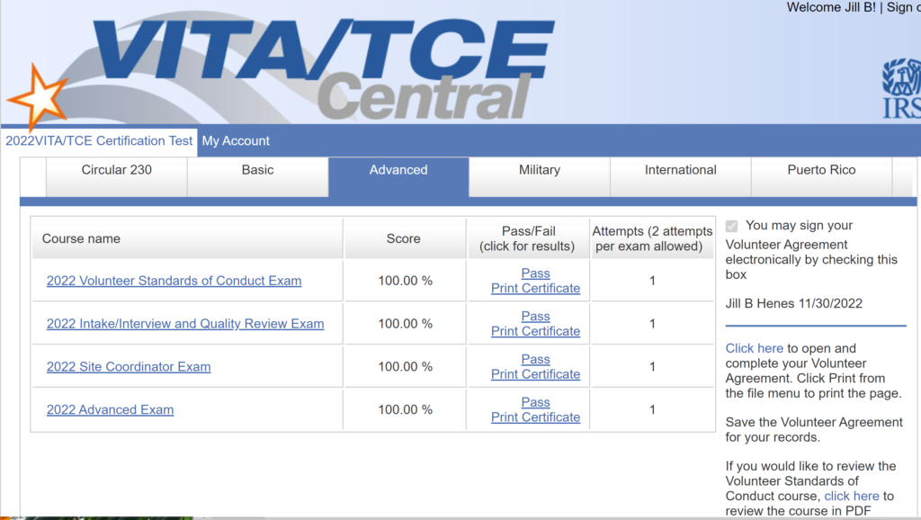 Volunteers who want to be counselors must pass an advanced certification exam before they can do tax preparation as counselors. The test is open book and must usually be completed by the end of the January training sessions, and no later than the beginning of the tax season. Printed course material will be available, but the entire course can be accessed – and the test can be taken – on the internet at the Link and Learn Website all year.