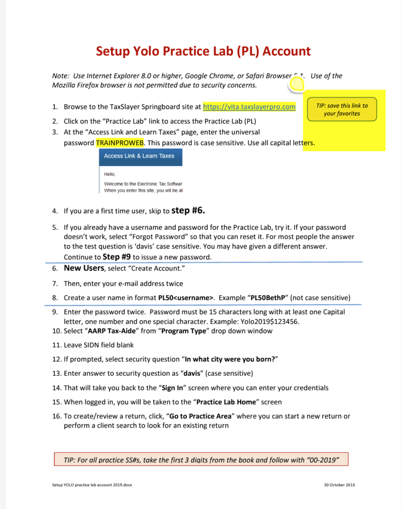 To prepare for the tests, we have materials and exercises for training. First, you need to sign into the TaxSlayer Practice Lab.