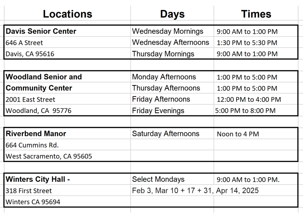 Yolo County has several sites and sessions: (the days and times are tentative at this point and subject to change by us or our host sites) We start Tax Preparation the first week of February.